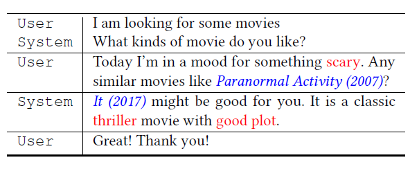 虽然这些研究在一定程度上提高了CRS的性能,但仍有两个主要问题有待解决。首先,会话主要由几句话组成,缺乏足够的上下文信息,无法准确理解用户的偏好。如上表所示,一个用户正在寻找类似于“Paranormal Activity(2007)”的恐怖电影,其中用两个短句子描述了他/她的偏好。为了获取用户的内部信息,我们需要充分利用上下文信息并对其建模(e.g. 理解单词“scary”和电影“Paranormal Activity(2007)”背后的语义)。显然,单凭对话文本很难获得这样的事实信息。第二,对话内容用自然语言表示,而实际用户偏好则反映在商品或实体上(例如,演员和电影类型)。这两种数据信号之间存在天然的语义差异。我们需要一种有效的语义融合方法来理解或生成对话内容。如上表所示,如果不能拟合语义上的鸿沟,就无法生成解释推荐的文本(e.g. “thriller movie with good plot”)。