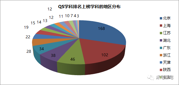 这个榜单中,北京、上海因为有超一流高校北京大学、清华大学、上海交大等位列前二。北京、上海、江苏、湖北四个省市的上榜学科占比超过6成。