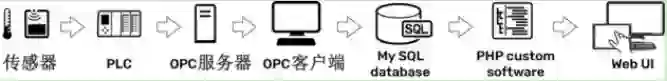 • 最后他们找了前端工程师,使用PHP一种基于服务器的脚本语言,来开发性的网页界面。他们的整个系统架构作为IIoT工业物联网,显示于下图。虽然复杂且成本较高,但是系统也工作了。自动化工程师和IT人员最终完成了这个任务,但是他们希望能够有更简单,低成本的解决方案。
