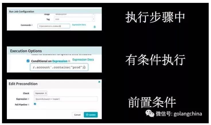 Pipeline 表达式很厉害,它的表达式是用 Grovvy 来做,大家知道 Grovvy 是一个动态语言。凡是 Grovvy 能用的语法,在字符串的地方都可以用。所以,这些步骤中,可以说这个步骤参数是来自表达式。也可以说有条件的执行,生成环境的时候才做这样的东西。也可以有前置条件,当满足这个条件的时候,这个流程和 stage 可以继续走下去。