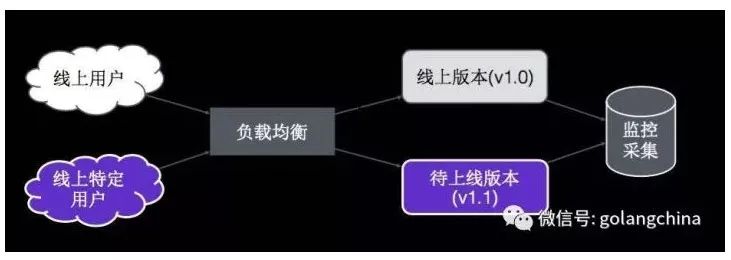 这个是 Canary 的意思,线上用户还是线上特定用户分成两组,线上用户访问老版本,特定用户通过负载均衡转发到特定的版本里,在后面有监控及和比较两个版本之间的差异。