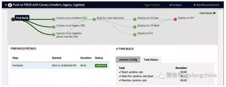 图 7是 Pipeline 的界面。首先,我觉得这个界面很好看。二是 Pipeline 可以做得非常灵活,可以说执行了前几个步骤之后,等所有的步骤执行完了再执行某个步骤。这个步骤是某个用户做某个审批,再分别执行三个步骤其中的一个步骤,然后再执行某个环节。也可以说要发布还是回退,发布是走发布的流程,回退就是回退的流程。总之在这个 Pipeline 里,你所期待的 Pipeline 的功能都可以提供。