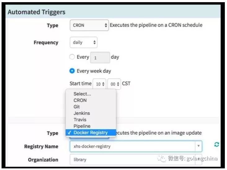 如图 10 是各种类型的表达式,从现在看起来,基本上各种要求都能满足了。Pipeline 可以自动触发(图 11),可以说每天、每周、每年、每月,某一天的时候要执行 Pipeline,做一个自动发布等等,也可以用今天新生成一个镜像的时候,Pipeline 去做发布。