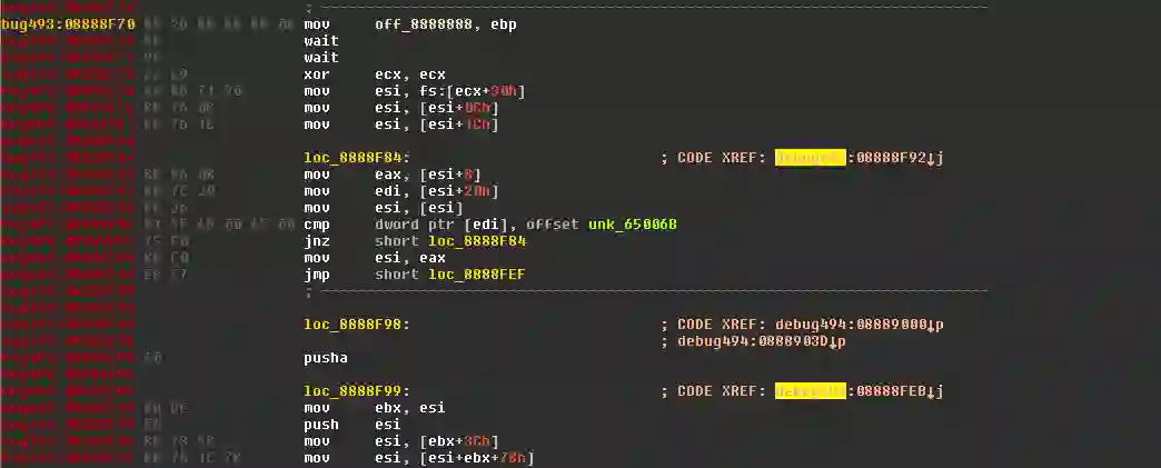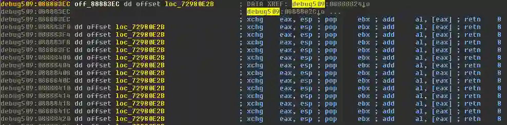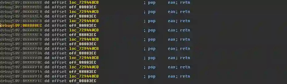 下一个ROP gadget会使用这个VirtualProtect指针来调用VirtualProtect(0x8888C90, 0×201, 0×40, 0x72A4C045)函数。执行这个操作后,程序控制权会移交给0x8888F70地址处的shellcode,这段shellcode会解密并执行内嵌的DLL: