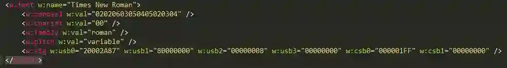 根据Office Open XML文件格式标准(ECMA-376)中的描述,“font”元素用来描述文档中使用的字体,正常的“font”元素如下所示: