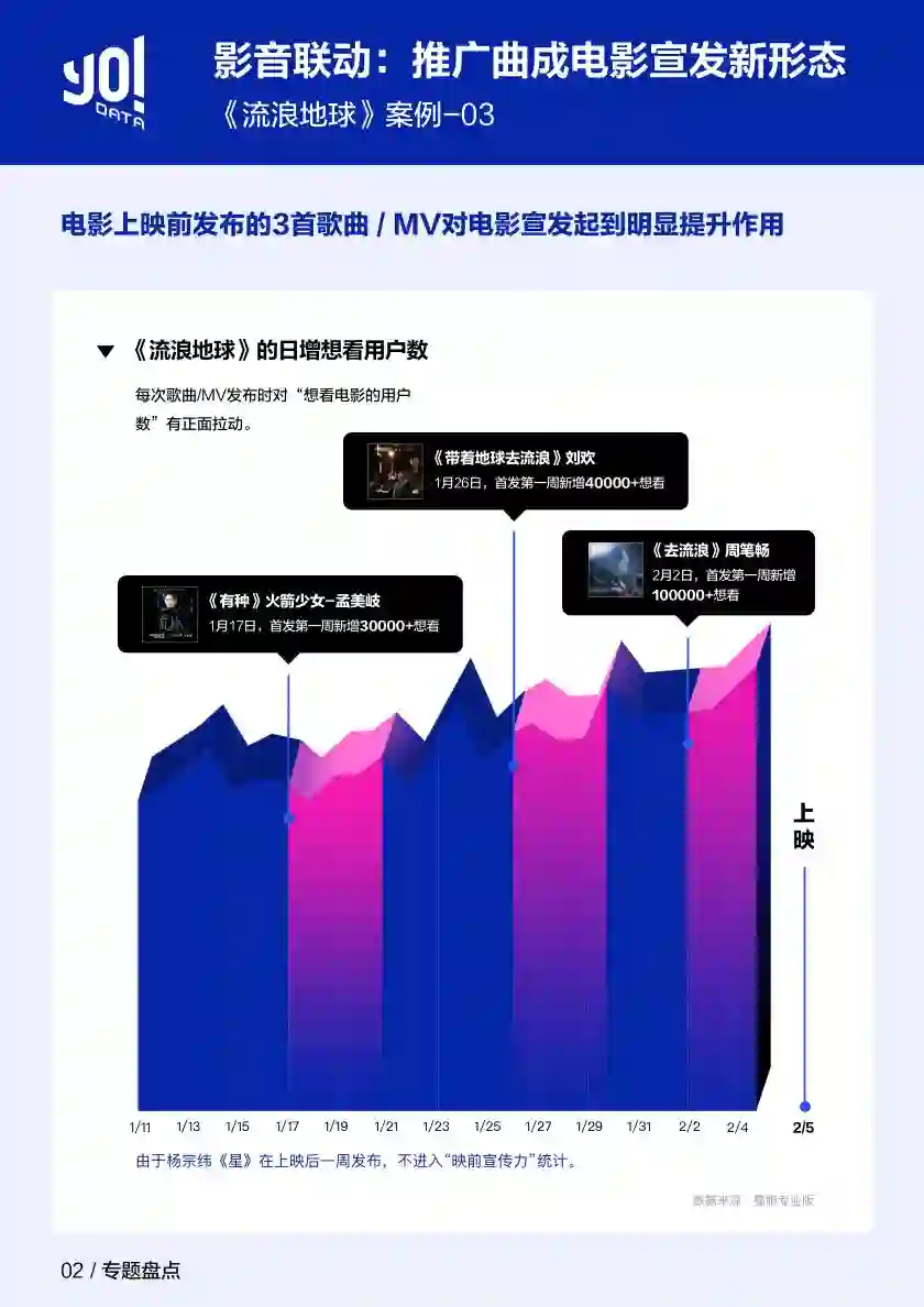 对此,Q1 季度报告总结出了影视作品音乐推广的核心策略:映前一个月为推广曲/主题曲的黄金发歌期,上映准三周前为最高峰。而这刚好切中了片方在宣发环节需要思考的核心命题:如何通过音乐精准地推广影视作品。