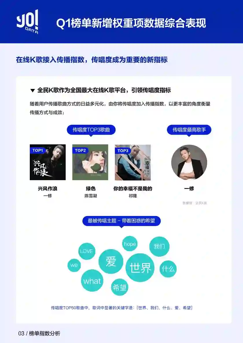 前不久,《由你音乐榜》发布了它上线半年以来的第二份季度报告——《由你数据库·新歌榜 Q1 季度报告》,Q1 季度报告源自《由你音乐榜》背后的「由你数据库」。季报的内容涵盖趋势综述、专题盘点、榜单指数分析、节日趣事这些几乎完全面向于行业端的内容。