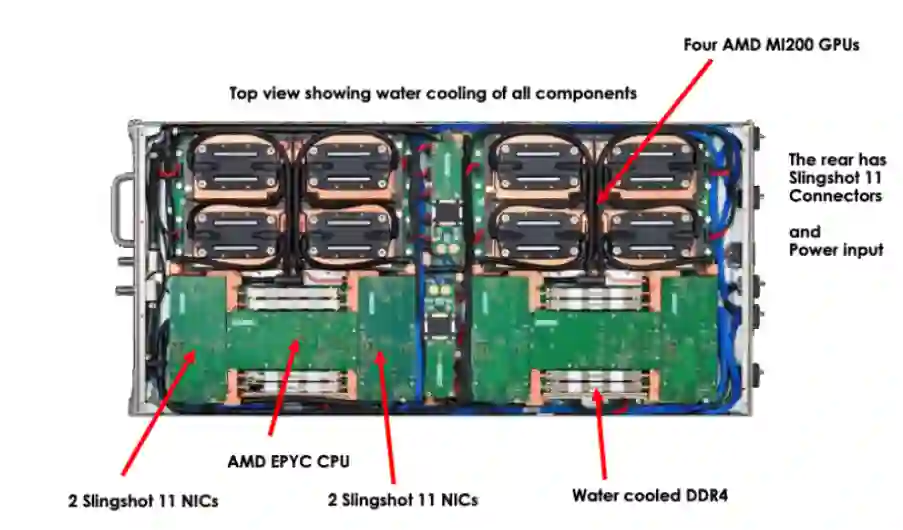 Frontier 由 74 个 Cray EX 机柜组成,可容纳 9408 个节点,每个节点配备一个 AMD Milan「Trento」7A53 Epyc CPU 和四个 AMD Instinct MI250X GPU,GPU 总数为 37632。节点通过 HPE 的 Slingshot-11 互连连接。每个节点 CPU 支持 512GiB DDR4 内存,跨节点支持 512GiB HMB2e(每 GPU 128GiB)内存。