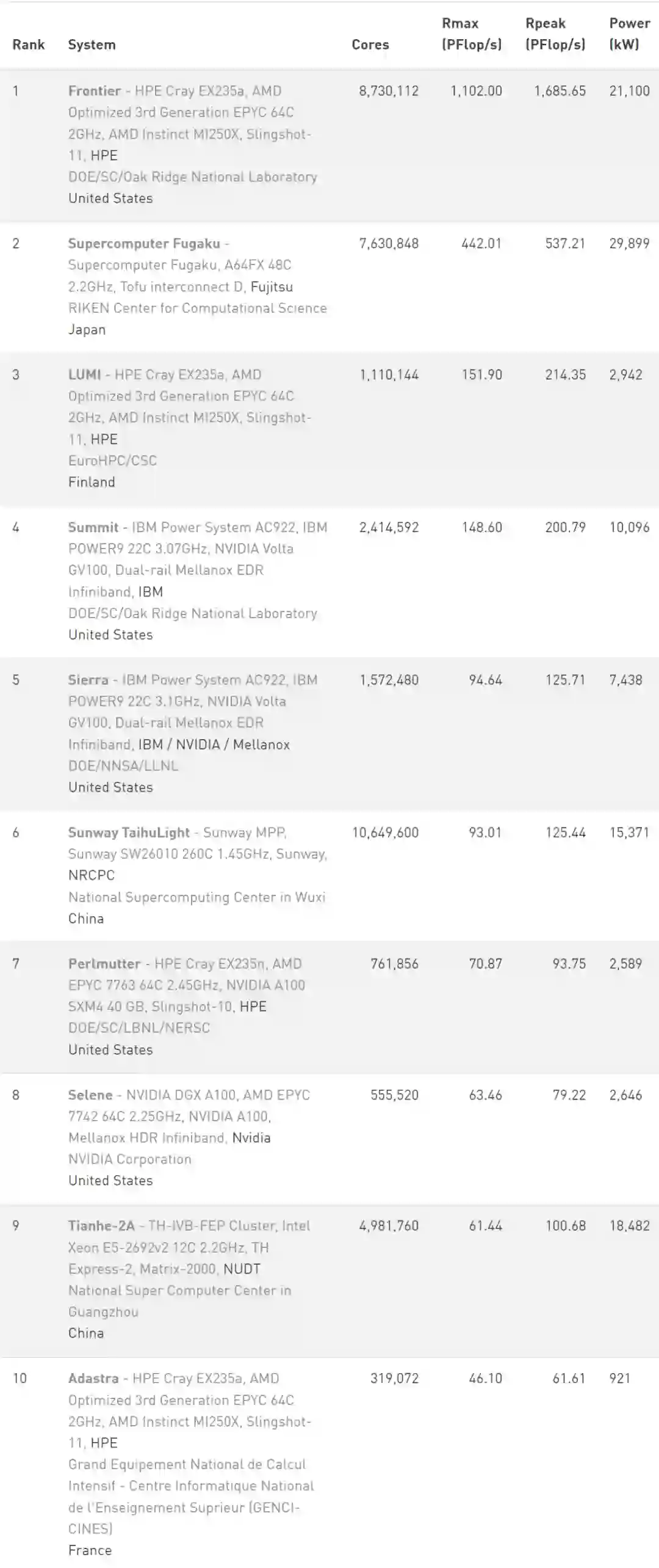 美国的 Frontier、芬兰的 LUMI 和 法国的 Adastra
