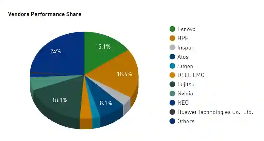 联想是 Top500 榜单上的常客,其参与基准测试的新系统数量最多(17 个),在 14 个新系统中,HPE 的数量位居第二(其中 7 个采用 AMD+AMD 节点,通过 Slingshot-11 连接,包括 三个 NNSA/LLNL 系统)。在所有 500 个系统中,按纯系统数量计算的阵容是联想(180 个)、HPE(84 个)和浪潮(50 个)。按性能份额比较的话,排名依次为:HPE(18.6%)、富士通(18.1%)和联想(15.1%)。