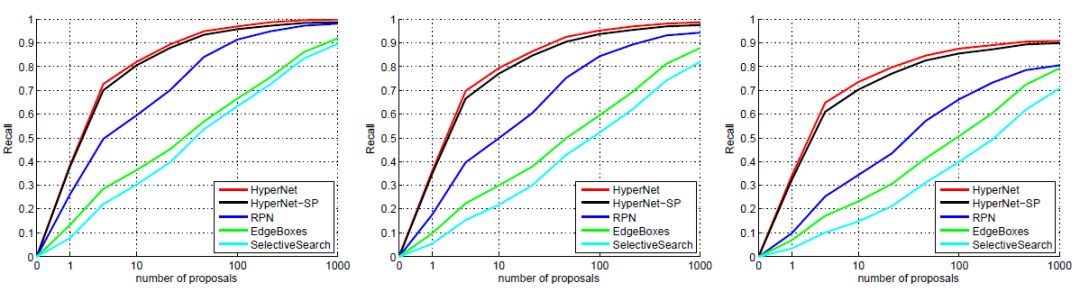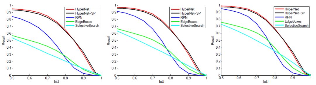 图5  在VOC2007测试集的Recall和后选数量。Left:IoU=0.5;Middle:IoU=0.6;Right:IoU=0.7。
