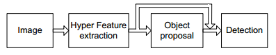 HyperNet框架如图2所示,首先,一张完整的图片通过卷基层向前传递,并产生不同的激活映射。将多层特征图融合,然后将他们压缩到一个统一的空间,命名为“HyperFeature”。接下来,一个简单的区域后选产生网络被构建并产生了大约100个候选区域。最后,这些后选区域被分类并调整基于目标检测模块。