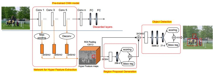 提出了一个HyperNet框架,共同用于区域后选产生和目标检测。HyperNet提供了一个有效的结合框架,用深度但有更高的语义、中间但互补和底层但自然高分辨率的CNN特征。所提框架的亮点是它可以产生少量的后选区域,但是能得到较高的recalls,其基本的HyperNet和加速的HyperNet都能都达到很好的准确度。