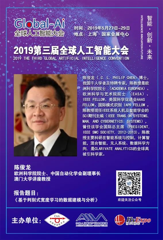 简介:陈俊龙(C. L. Philip Chen)博士,中国自动化学会副理事长,国家千人学者、国家特聘专家,澳门科协副会长,澳门机器人与人工智能学会会长,澳门大学讲座教授及科技学院前院长,华南理工大学计算机学院院长。陈教授是IEEE Fellow(院/会士)、美国科学促进会AAAS Fellow(院/会士)、国际模式识别IAPRFellow(院/会士)、欧洲科学院院士(Academia Europaea)、欧洲科学与艺术院院士(EASA)、国际系统及控制论科学院 IASCYS 院士、自动化学会(CAA)、及香港工程师学会(HKIE) Fellow。陈教授现任IEEE系统人机及智能学会的SCI期刊主编(IEEETrans. onSystems, Man, and Cybernetics: Systems),曾任该学会国际总主席 (President of the SMCS, 2012-2013),荣获学会的4次杰出贡献奖。陈教授主要科研在智能系统与控制,计算智能,混合智能,数据科学方向,是2018 Clarivate Analytics2018年计算机科学学科的全球高被引科学家。文章详见:
