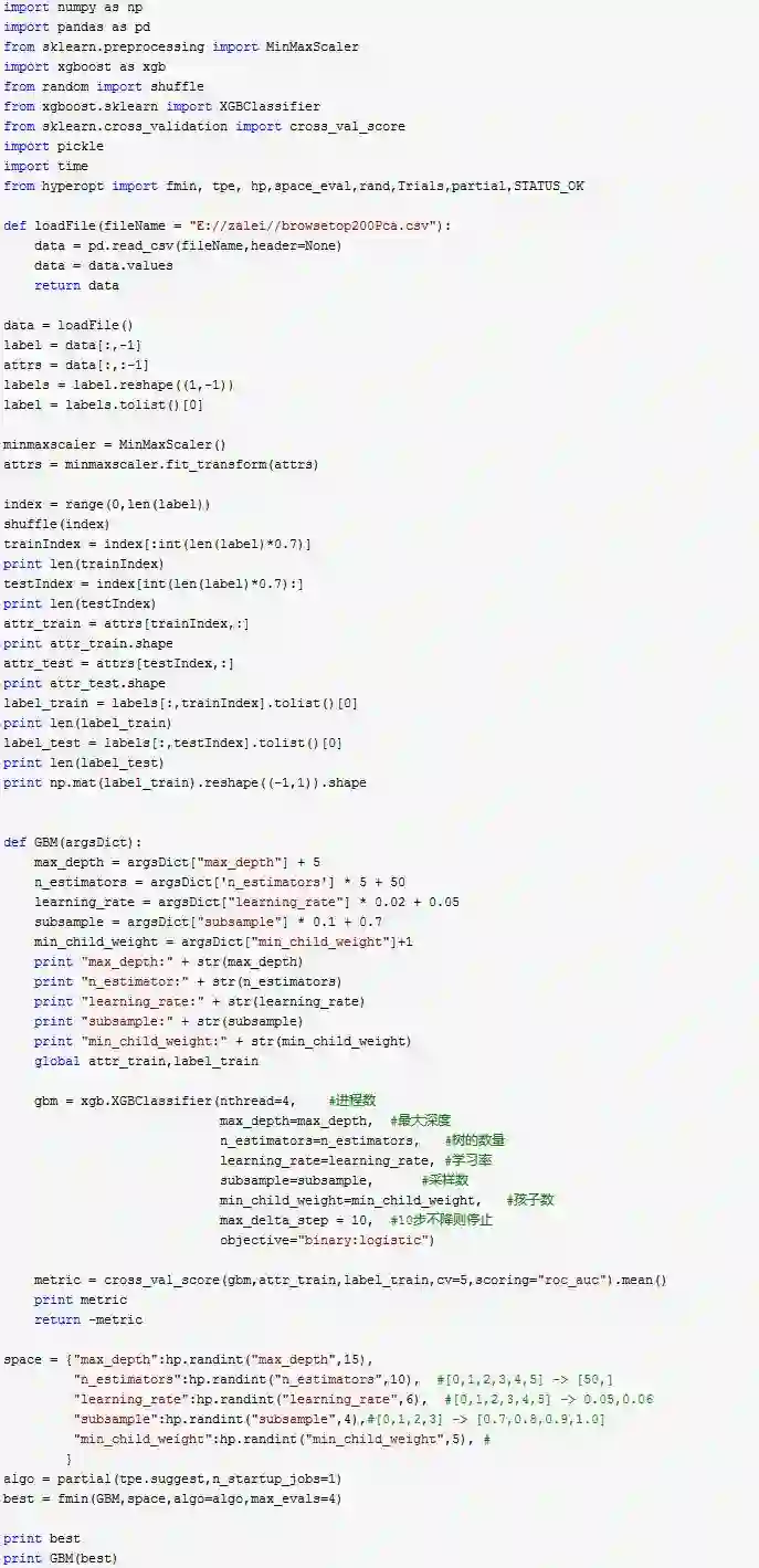 xgboost具有很多的参数,把xgboost的代码写成一个函数,然后传入fmin中进行参数优化,将交叉验证的auc作为优化目标。auc越大越好,由于fmin是求最小值,因此求-auc的最小值。所用的数据集是202列的数据集,第一列样本id,最后一列是label,中间200列是属性。