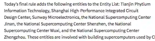 美国实体名单禁止美国公司向被认为对美国利益构成重大威胁的组织提供关键技术。 据悉,被列入美国实体清单的公司在寻求从美国供应商处接收物品的许可时,需要向商务部申请面临严格审查的许可证。 新规则立即生效,但不适用于已经在途的美国供应商的货物。 这次打击可能与E级超算有关,据悉这七家公司都与之有关。E级超算是指百亿亿次超级计算机。 位于上海西北的国家超级计算无锡中心,运行着2016年6月至2018年6月位居世界第一的神威·太湖之光 (Sunway TaihuLight)。神威·太湖之光主要采用中国本土技术打造,是世界上首台峰值运算性能超过每秒十亿亿次浮点运算能力的超级计算机。 除此之外,其互联技术是基于Nvidia-Mellanox HDR InfiniBand。该系统的制造商申威公司就在名单之中,目前正在开发基于中国技术的超大规模系统。 上一次中国超算机构被列入黑名单是在2019年6月,涉及了中科曙光、海光、成都海光、成都海光微电子技术和江南计算技术研究所。据报道,此举破坏了中科曙光首次推出300+petaflops新系统的计划,该系统将在超级计算排行榜上名列前茅。 再往前追溯到2015年,以下中国机构被列入实体名单:国防科技大学、长沙国家超级计算中心、广州国家超级计算中心(NSCC-GZ)和天津国家超级计算中心。 目前世界上公开宣布的最快的超级计算机是日本的Fugaku。它在2020年6月以415.5的Linpack评分获得了Top500榜单的第一名,并在2020年11月以442 petaflops的Linpack评分提高了领先优势。