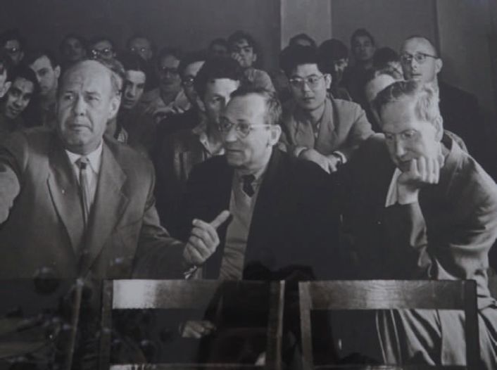 图2 周光召先生(二排右2)在杜布纳联合原子核研究所工作期间参加学术讨论会,前排左起:联合所所长布洛欣采夫院士(Dmitry Blokhintsev),高能粒子研究室主任维克斯勒通讯院士(Vladimir I. Veksler)、周光召在联合所的导师马尔可夫院士(Moisey Markov)