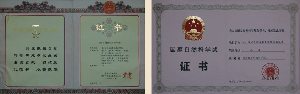 图3 周光召获1989 年国家自然科学二等奖(量子场论大范围性质的研究)和2001 年国家自然科学二等奖(统一描述平衡与非平衡体系的格林函数理论研究)