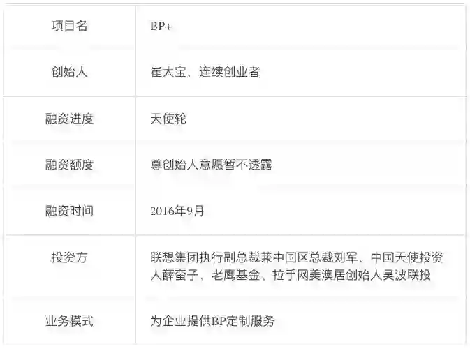 去年9月,BP+完成天使轮融资,投资方为联想集团执行副总裁兼中国区总裁刘军、中国天使投资第一人薛蛮子、老鹰基金、拉手网美澳居创始人吴波。