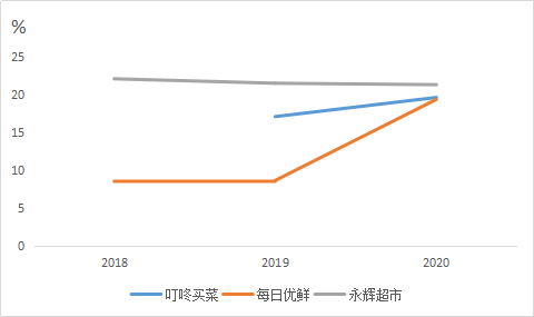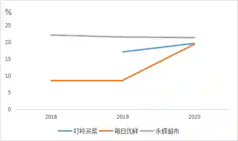 除了高昂的履约费用外,相比传统商超,大多数的前置仓企业由于库存面积等客观条件的限制,均将业务重心放在高频、刚需的生鲜零售上,进而导致了SKU不足、客单价较低等劣势,再加上目前市场开拓有限,订单量及复购率不足,因此多数企业的毛利水平都不堪入目。举例来看,2018-2020年,永辉超市的毛利率均在21%以上,高于每日优鲜、叮咚买菜,同期每日优鲜毛利率则为8.57%、8.68%、19.42%,2019-2020年叮咚买菜毛利率为17.14%、19.68%。