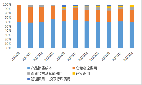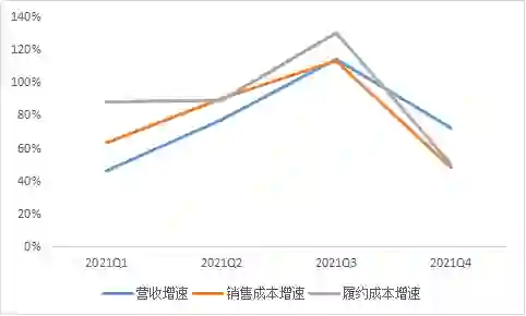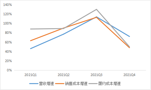 以叮咚买菜为例,拆分成本费用项目,履约成本(仓储物流费用)是除产品销售成本以外的最大支出项,2021年Q1-Q4,仓储物流费用在营业支出中的占比接近30%,占营收比重接近40%。从增速来看,2021年Q1-Q4,叮咚买菜的履约成本上涨速度远远超过同期营收扩张及销售成本的增速。
