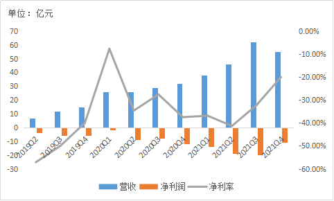 2019-2021年,叮咚买菜净亏损金额分别达到18.73亿元、31.77亿元、64.2亿元,亏损幅度逐年扩大。而同一赛道的另一龙头每日优鲜2018-2020年(2021年暂未公布)的净亏损分别为22.32亿元、29.09亿元和16.49亿元。