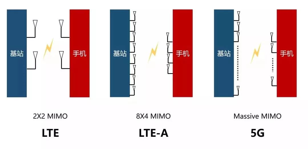 MIMO就是“多进多出”(Multiple-Input Multiple-Output),多根天线发送,多根天线接收。在LTE时代,我们就已经有MIMO了,但是天线数量并不算多,只能说是初级版的MIMO。