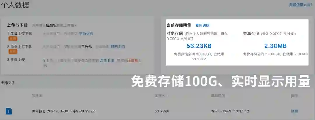 至于传输的流程,省钱又快的方式是,通过oss命令工具,先把数据从本地上传到个人数据空间,云盘容量限免50G,训练时,再从个人数据空间下载到实例里。