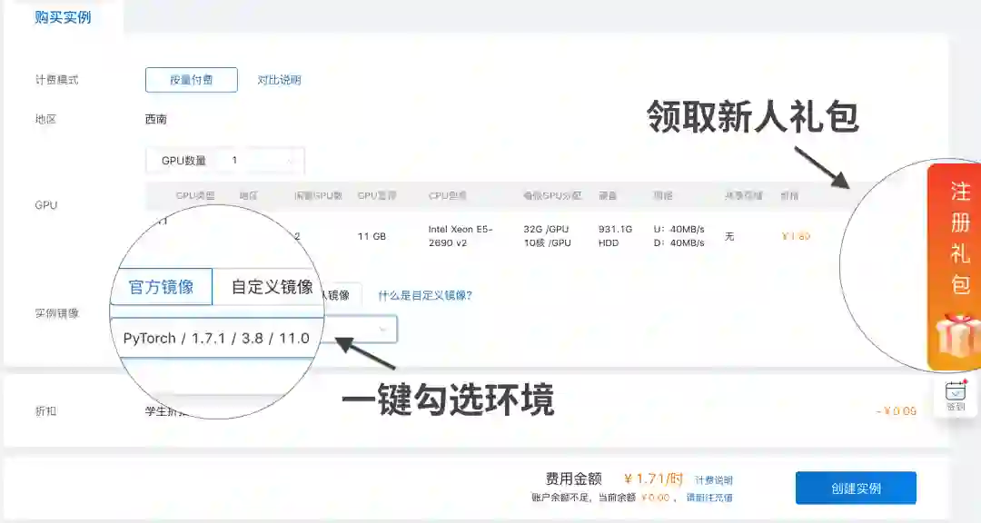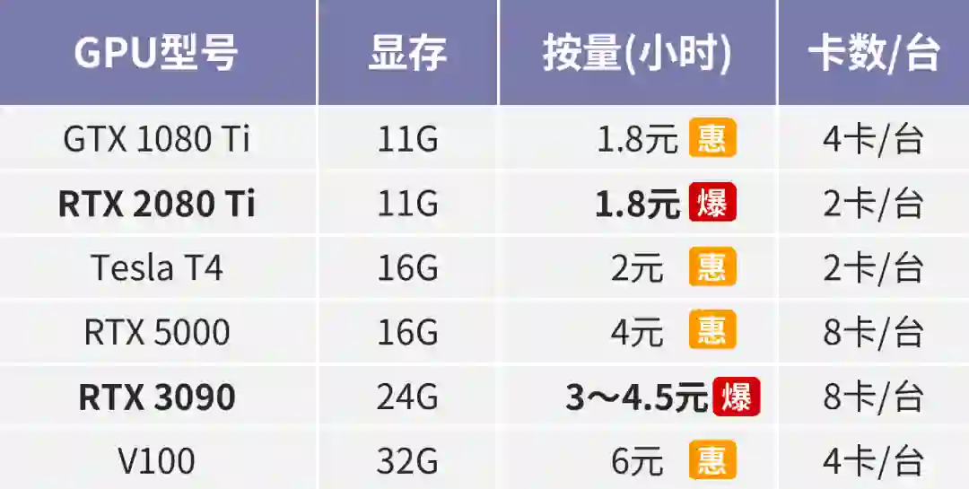 正式创建实例前,选择适合的GPU非常重要,如果模型耗显存,可以考虑16G的5000、24G的3090、32G的V100,如果耗内存,也有单卡分配了64G CPU的机型,具体参考下方的价格表(自己做的,有点简陋请忍住~
