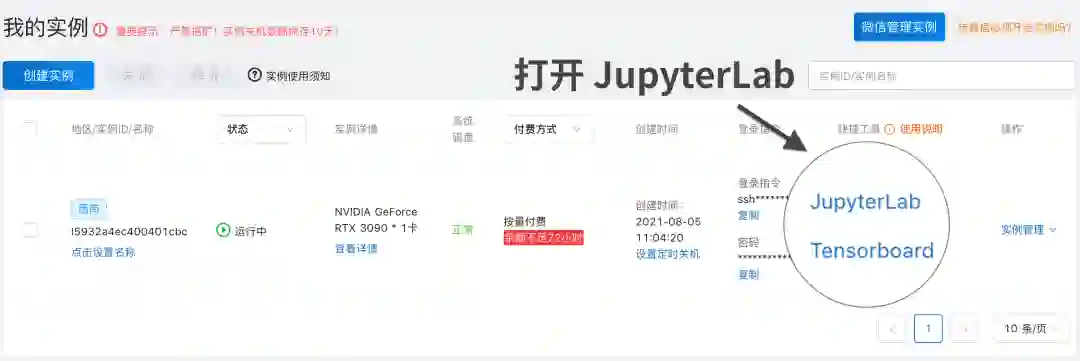 几秒完成实例创建后,就可以连接登录实例了,平台支持Xshell、PuTTY、MobaXterm之类的ssh终端登录,JupyterLab、PyCharm、VSCode等编译工具,文档也有详细的使用说明。