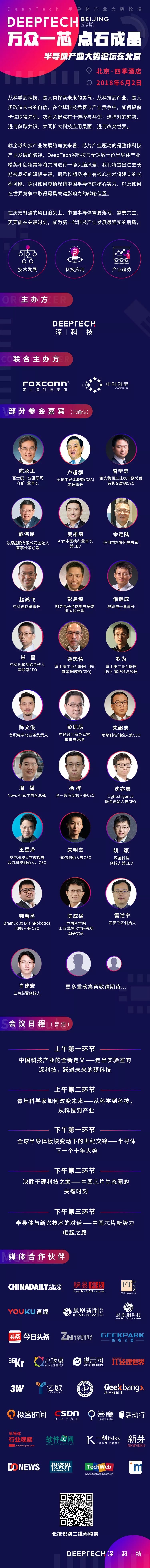 此次 DeepTech 深科技联合富士康科技集团、中科创星于 2018 年 6 月 2 日举行 “万众一芯,点石成晶” 北京峰会,汇集数十位纵横全球科技产业的领袖精英级人物,将在当天丰富的全日议程中,为到场参会来宾深度剖析中国科技产业新一波大潮将至的机遇与方向。
