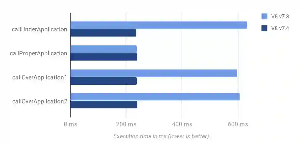 在某些情况下,比如当被调用的是严格模式的函数时,既不使用参数也不使用 rest 参数,这时候就完全不需要去进行参数自适应。现在 V8 在这种情况下就直接跳过这一自适应过程,将调用开销减少了超过 60%。