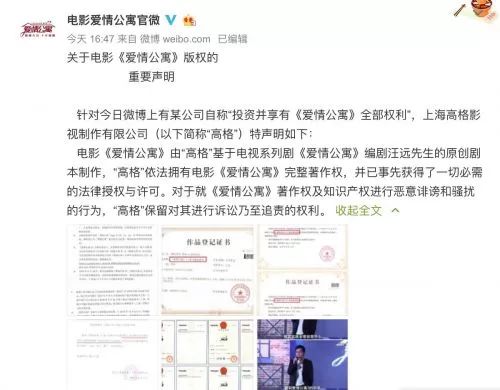 随后,电影爱情公寓官微发布声明回应称,电影《爱情公寓》由上海高格影视制作有限公司(以下简称“高格”)基于电视系列剧《爱情公寓》编剧汪远先生的原创剧本制作,“高格”依法拥有电影《爱情公寓》完整著作权,并已事先获得了一切必需的法律授权与许可。对于就《爱情公寓》著作权及知识产权进行恶意诽谤和骚扰的行为,“高格”保留对其进行诉讼乃至追责的权利。