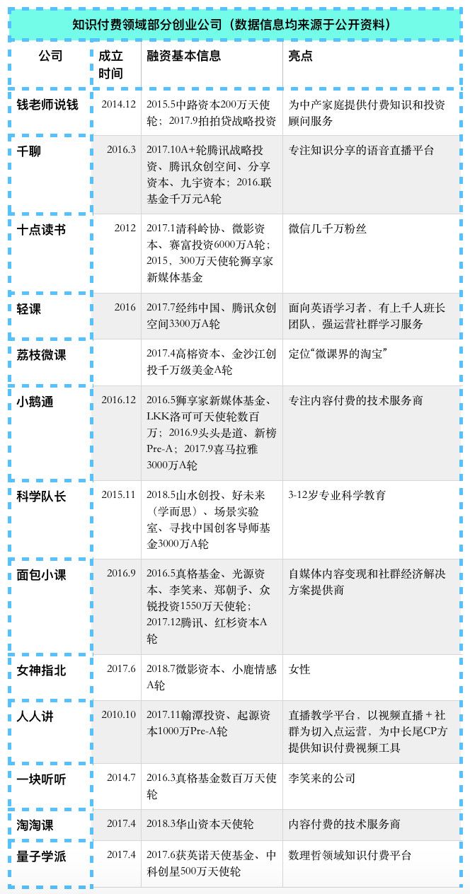 最后,我们梳理了知识付费行业的创业项目,并简要说明了它们各自的亮点,供投资人、创业者参考。
