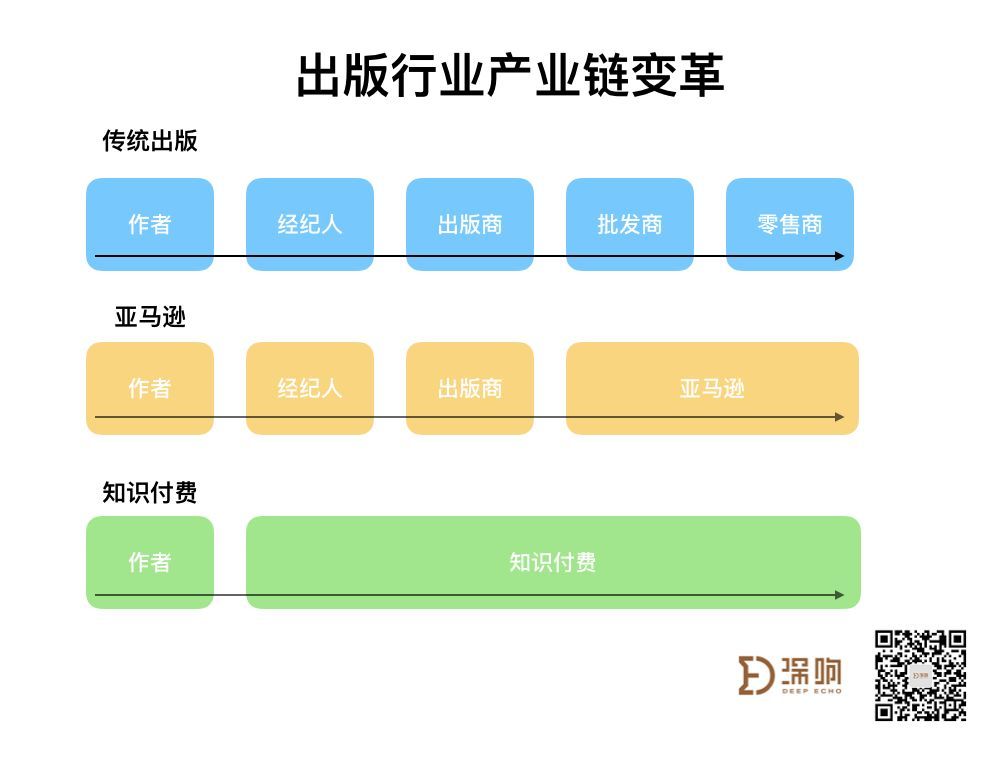 传统出版行业包括作者-经纪人-出版商-批发商-零售商五个环节,亚马逊整合了批发商和零售商,而知识付费则整合了更多。