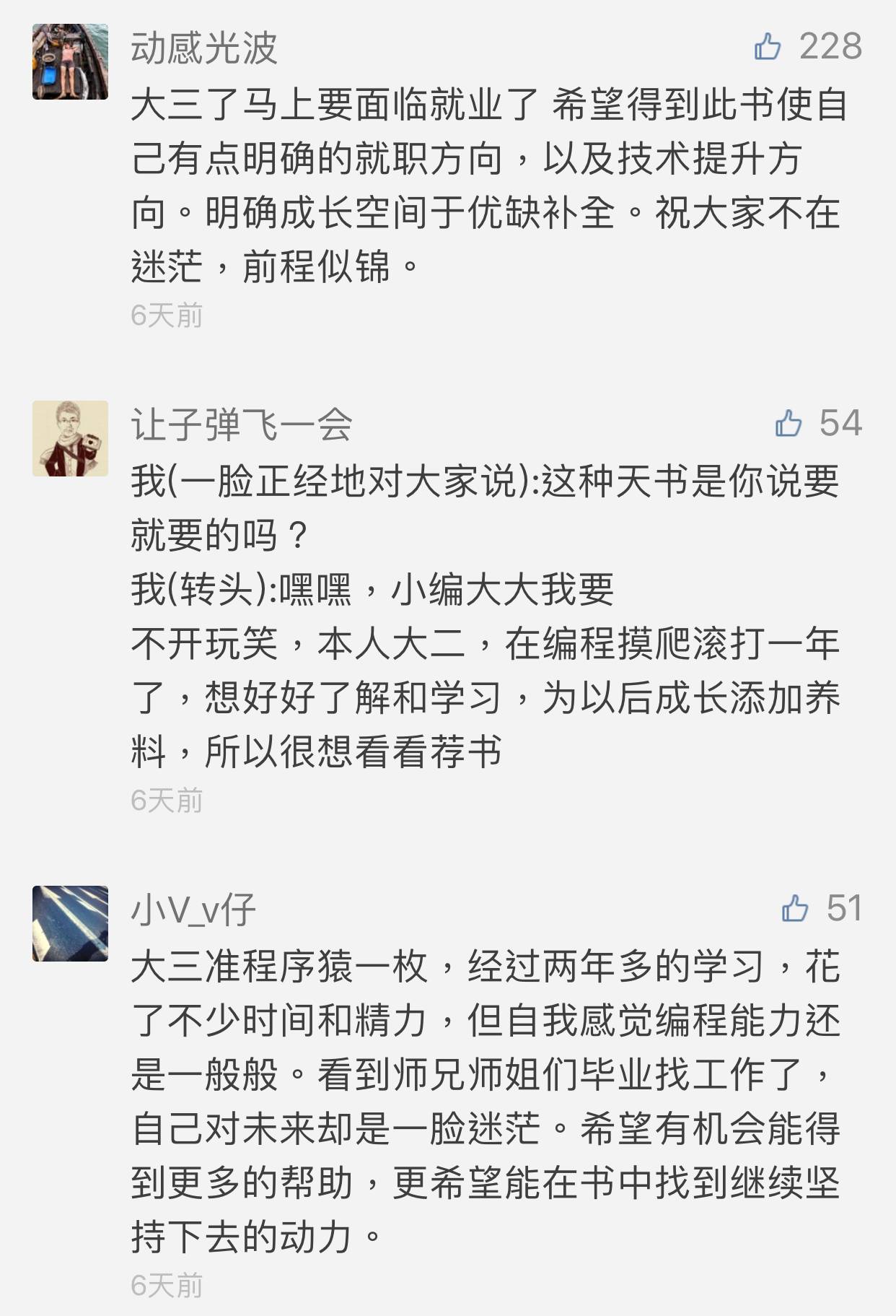 如果你对本书感兴趣,可在本文下方留言,说出自己的申请理由,小编会放出有价值的评论,且根据用户评论点赞数+申请理由+上一期是否中奖综合之后,挑选出3 名参与荐书的小伙伴。