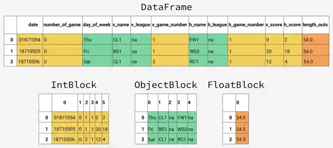 你可以看到这些块并没有保留原有的列名称。这是因为这些块为存储 dataframe 中的实际值进行了优化。pandas 的 BlockManager 类则负责保留行列索引与实际块之间的映射关系。它可以作为一个 API 使用,提供了对底层数据的访问。不管我们何时选择、编辑或删除这些值,dataframe 类和 BlockManager 类的接口都会将我们的请求翻译成函数和方法的调用。