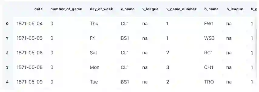 下面我们总结了一些重要的列,但如果你想了解所有的列,我们也为整个数据集创建了一个数据词典:https://data.world/dataquest/mlb-game-logs/workspace/data-dictionary。