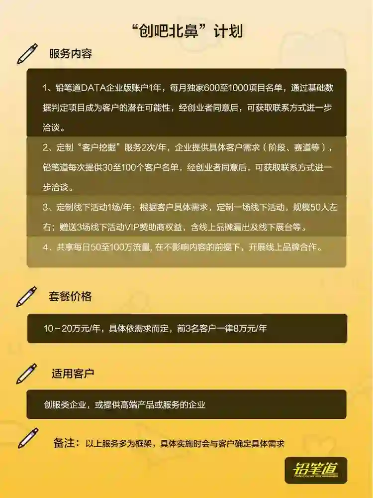 再次,针对创业者或企业,我们将推出“创吧北鼻”计划,满足企业客户在市场、品牌、销售环节需求,包含四大权益: