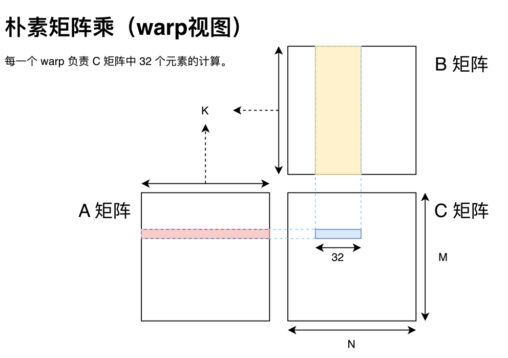 我们先还是让每一个 thread 负责一个目标矩阵元素的计算。虽然这种分配方式十分朴素、十分直接,同时各个 thread 之间也没有数据依赖关系,不需要做额外的同步之类的操作,但这种分配方式却是十分访存不友好的,因为每一个 thread 都是直接与内存做交互,而 GPU 的全局内存访问带宽完全不足以匹配上它的计算速度。