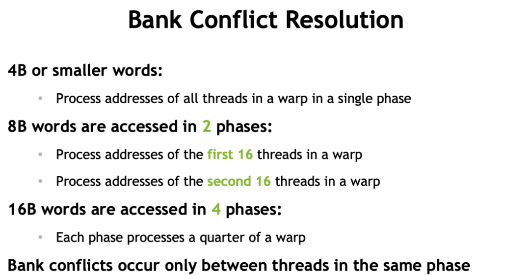 2. 两个或多个 thread 访问的是同一个 bank 内的数据,那么此时这些 thread 的访问将会被强制安排为串行执行。这种访问情况被称为 bank conflict。