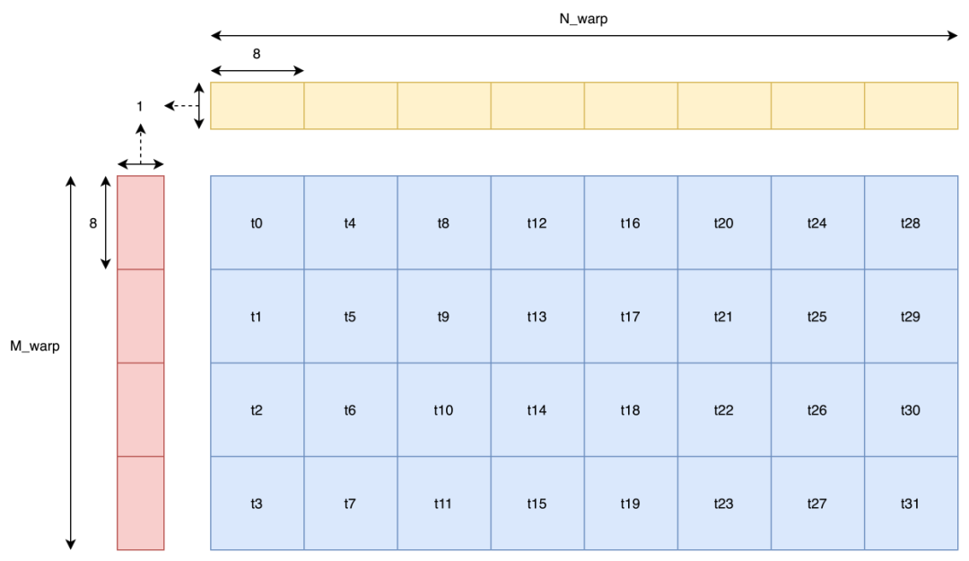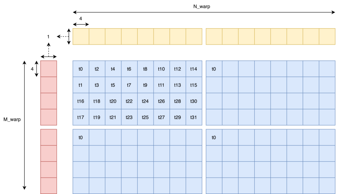 而上图中 t0-t7 同时操作,它们之间并没有 bank conflict,后面的 thread 依此类推,那么也就不会有 bank conflict。那么朴素的 warp tiling 实现代码在这: