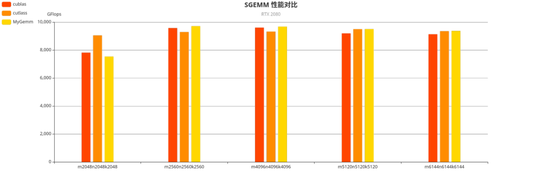 我们也可以注意到,在较大形状上手写的矩阵乘有着与 cublas 相近,甚至更优的性能。