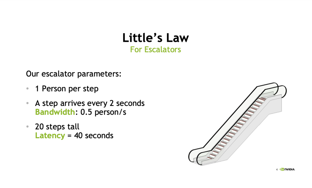 那么回到指令上来,每一个指令都有对应的延迟和带宽,而以朴素矩阵乘为例,每一个乘法运算需要读两次内存和一次 FFMA,假如没有其他额外的优化(如循环展开与指令重排),相当于是两个级联的自动扶梯,一个负责运送数据,一个负责做数学运算。假设数据运送扶梯的带宽与延迟与图中一致而不考虑 FFMA 的带宽与延迟,那么一次 FFMA 需要等待 40s(扶梯延迟)+ (1/0.5)s(第一个数据到达后第二个数据到达的时间)才能拿到所需的数据,这与扶梯的带宽 0.5s / 人的峰值性能相去甚远。那么此时这个 kernel 就完全被延迟卡住了,而无法发挥出应有的性能。