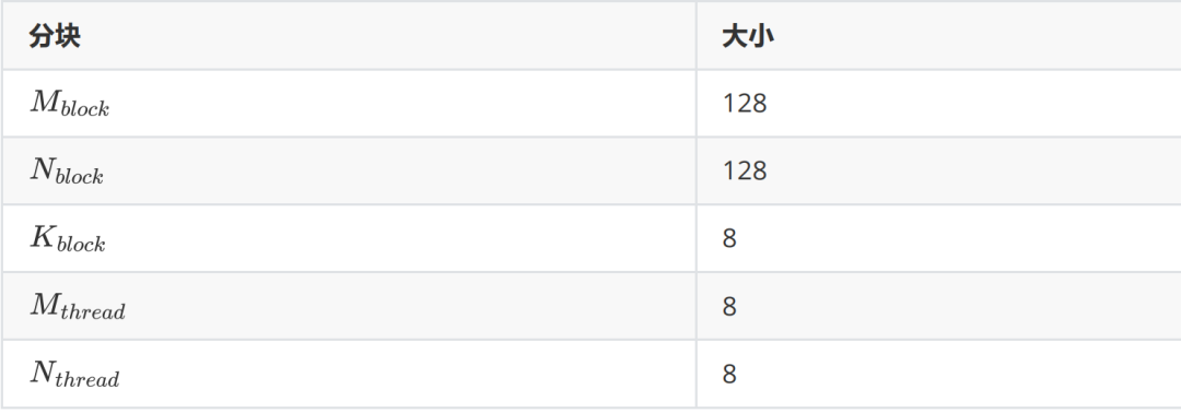 因此,我们能够做的就是在有一定理论分析的情况下确定好一些矩阵的分块大小的方案,然后要不就是经验性的去选择最终用哪个分块,要不就是跑一个 profile 来直接得到最快的分块。这里由于已经有非常多的先例证明了 128x128x8 是一个较优的选择,因此本文则遵从这个分块方案。那么,目前我们能够确定的分块如下表。