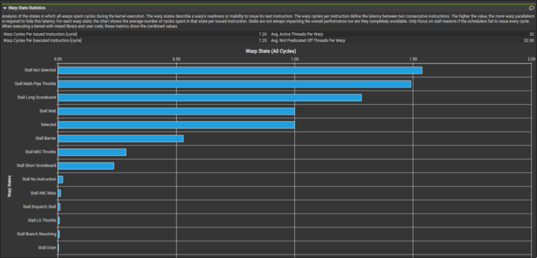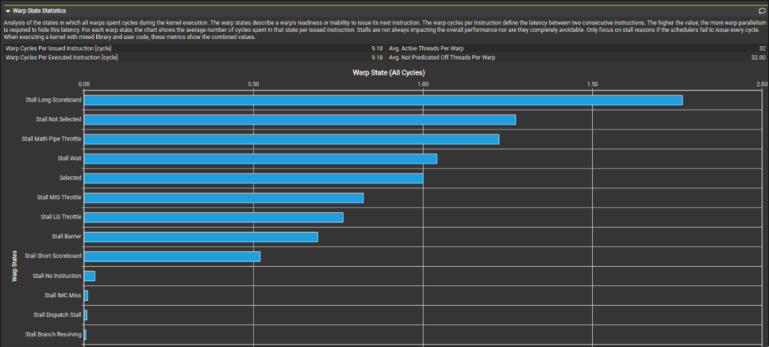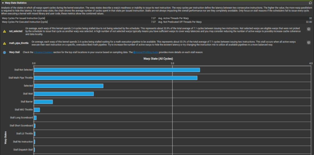 那么我们可以看出,对于访问同一数据量的数据,请求的指令越多,GPU 的聚合访问的压力就会越大。在极端情况下,尽管带宽足够,但大量的访存请求会塞满访问队列导致 stall。这在 Nsight Compute 中显示为 MIO Throttle 和 LG Throttle,即对应 shared memory 和 global memory。
