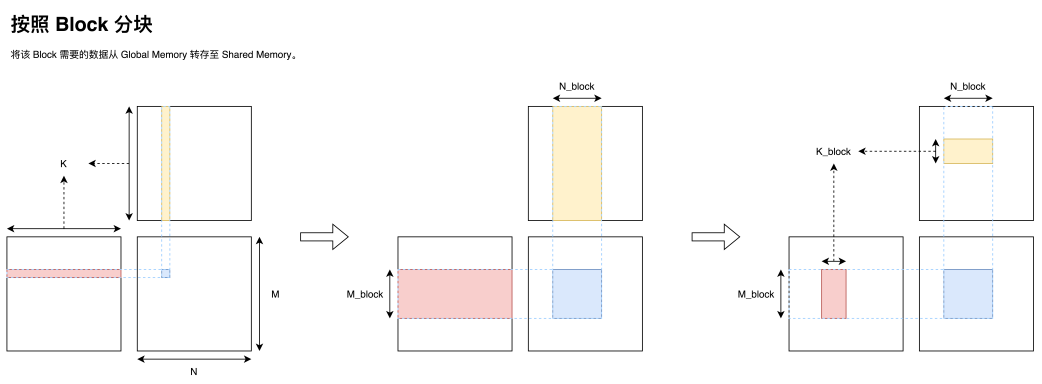 同时我们注意到处于同一行的 thread 总是会同样的读取 A 矩阵的同一行数据;同一列的 thread 总是会读取 B 矩阵的同一列数据。那么一个非常自然的想法则是对于每一个 Block,我们将数据移动到这个 Block 共享的一块高速存储区 shared memory 上,从而减少与全局内存交互的次数。同时我们考虑到 shared memory 的容量有限,因此可以一次只取一部分 k,然后通过循环迭代的方式完成这个 Block 所负责的矩阵乘区域。