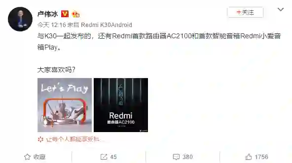 36氪获悉,小米集团副总裁、红米品牌总经理卢伟冰在微博透露,红米将发布首款路由器AC2100和首款智能音箱Redmi小爱音箱Play。