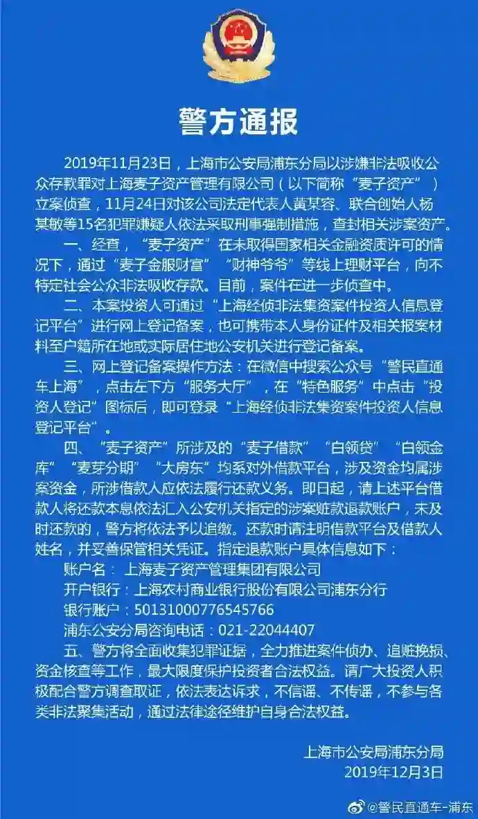 上海浦东警方:“麦子资产”涉嫌非法吸收公众存款,案件在进一步侦查中