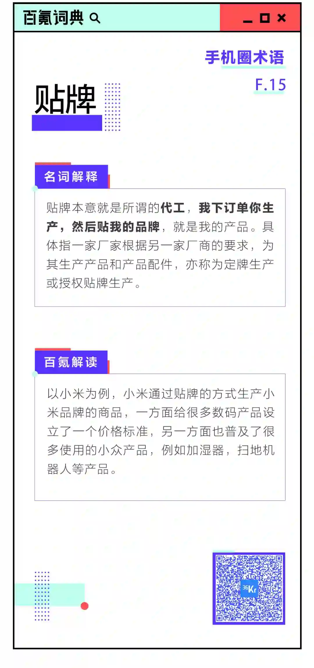 36氪「百氪词典」第六期——「手机圈术语」正式上线,用易懂的方式解读常用的互联网专业术语,丰富你的知识储备。今日解释词为「贴牌」
